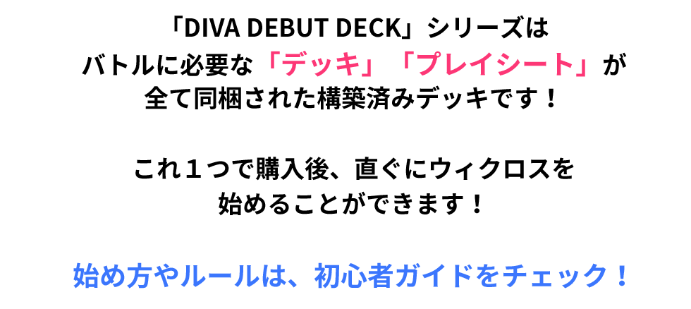 にじさんじ × WIXOSS新コラボ特設ページ 構築済みデッキ紹介 カードリスト キャンペーン情報! デッキ2種【特典付セット】を購入する 「DIVA DEBUT DECK」とは? 初心者ガイド 拡張パック カードリスト 商品仕様 にじさんじ ver.さんばか を購入する にじさんじ ver.さんばか【特典付セット】を購入する INTERLUDE DIVAを【ボックス】で購入する INTERLUDE DIVAを【パック】で購入する インフォメーション 【公式サイト リンク】