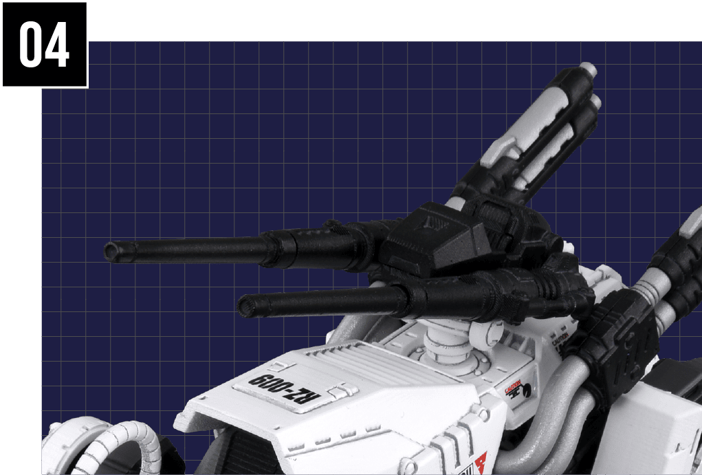 背部の50mm対ゾイド2連装ビーム砲座は上下左右に可動。さらに砲座部分には付属のパイロットフィギュアが搭乗可能。