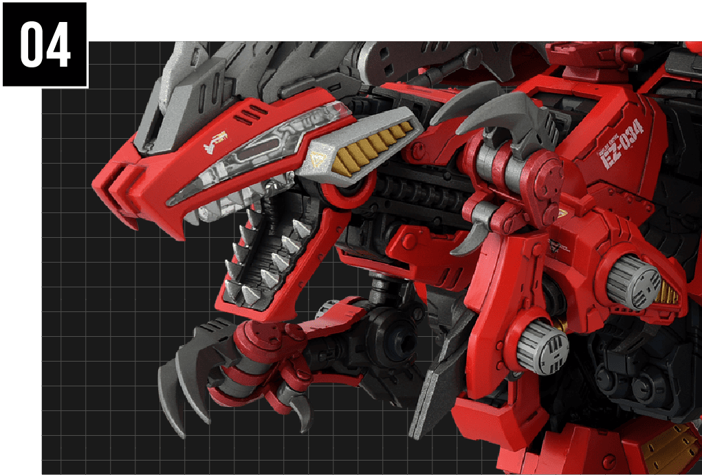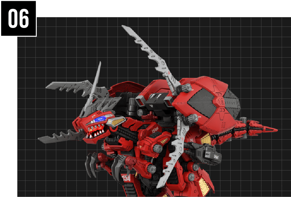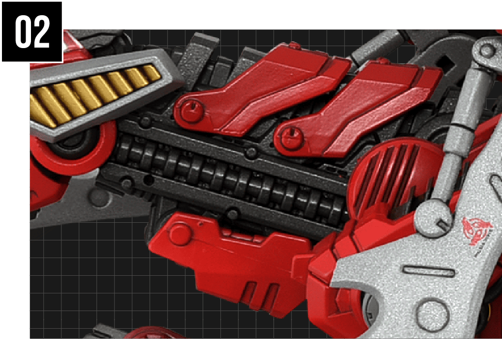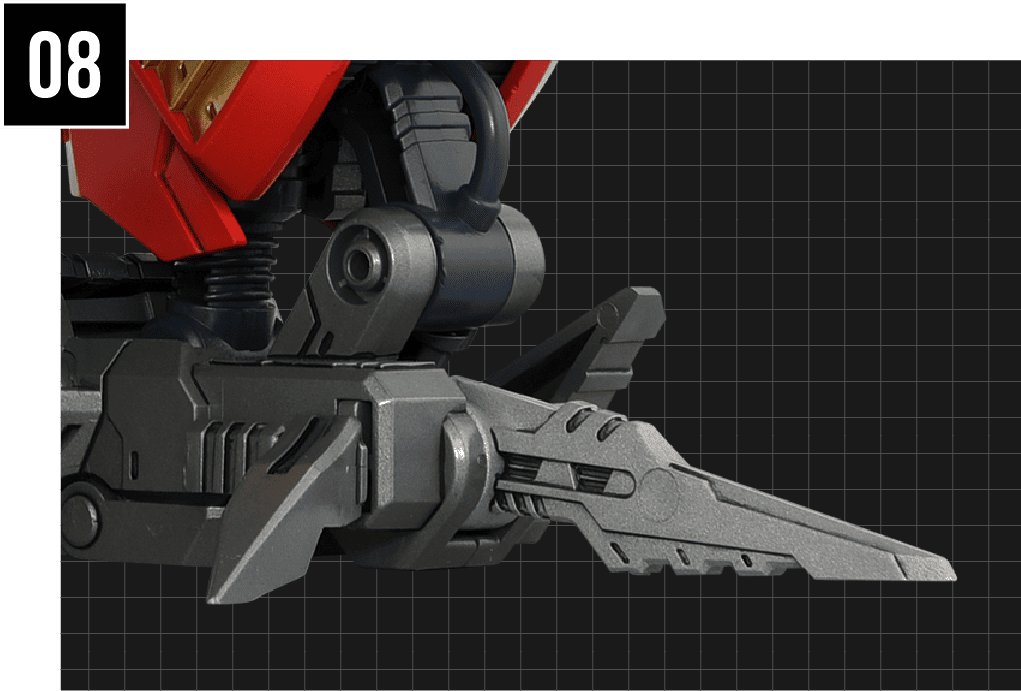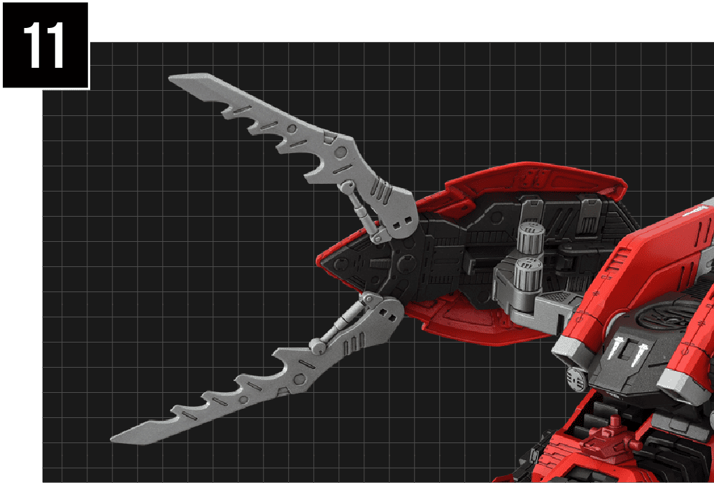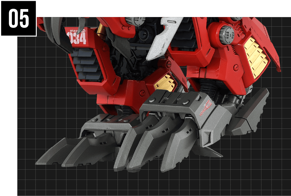 AZ-09ジェノザウラーで一新された脚部の構造、つま先が歩行と連動し、2足歩行ゾイド伝統の補助バーを必要としない動きを踏襲しつつ、さらに巨大な刃・エクスブレイカーが歩行に合わせて動き、旧キットにはない新たなギミックを搭載している。