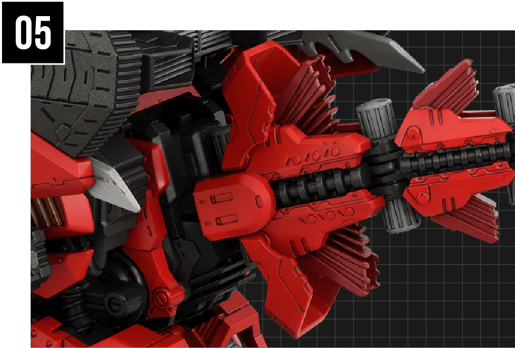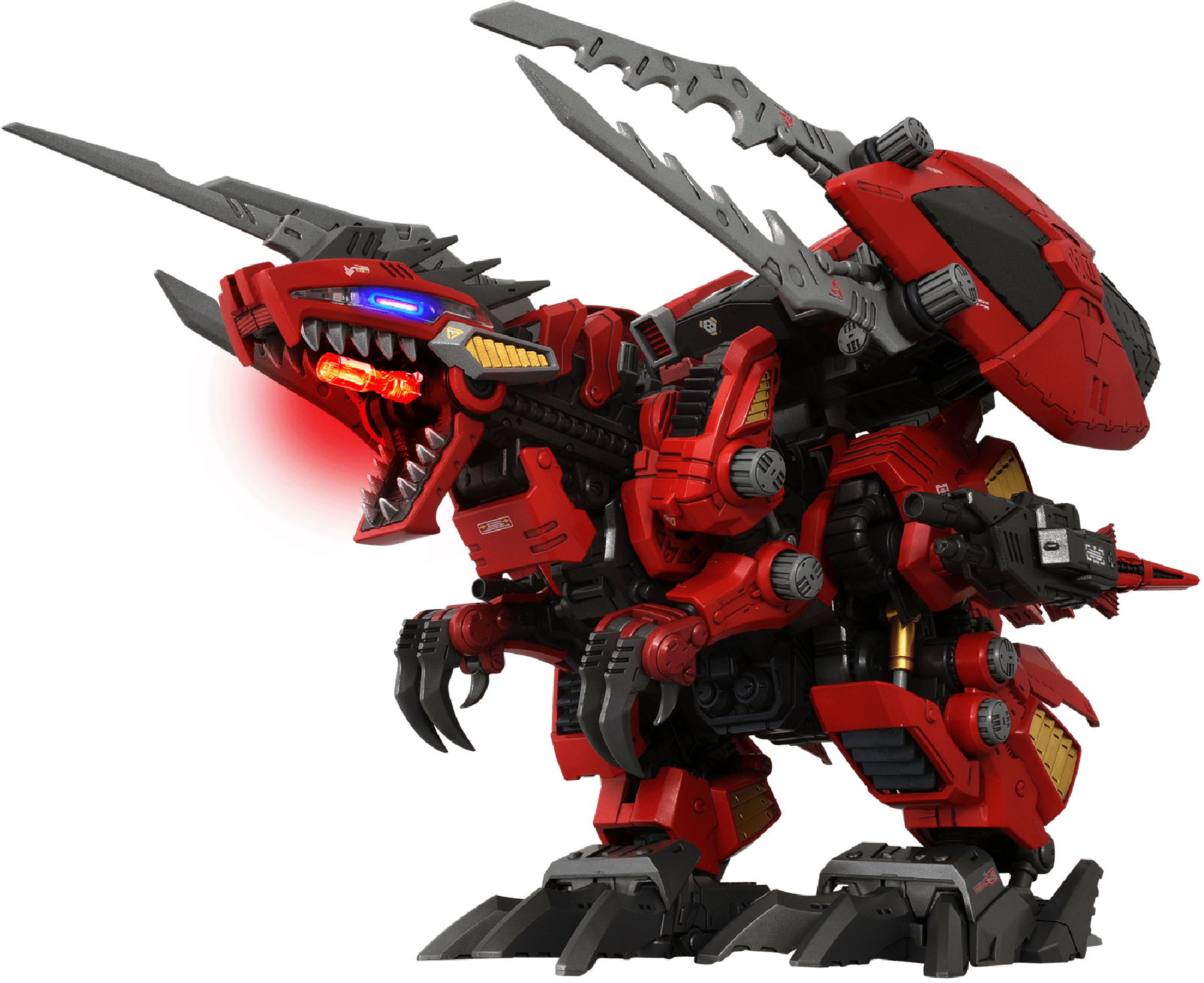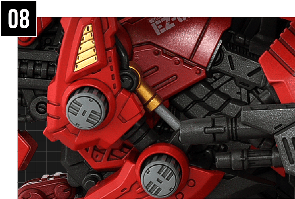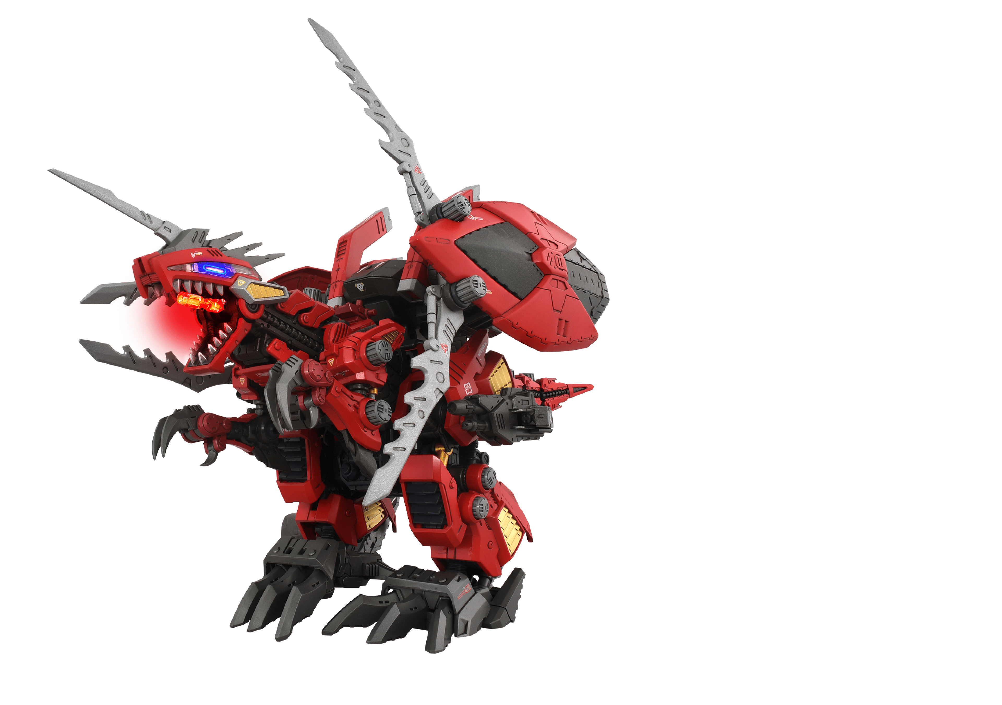 AZ-09ジェノザウラーで一新された脚部の構造、つま先が歩行と連動し、2足歩行ゾイド伝統の補助バーを必要としない動きを踏襲しつつ、さらに巨大な刃・エクスブレイカーが歩行に合わせて動き、旧キットにはない新たなギミックを搭載している。