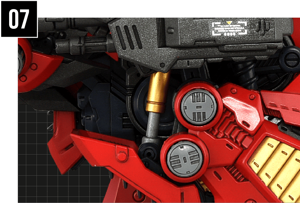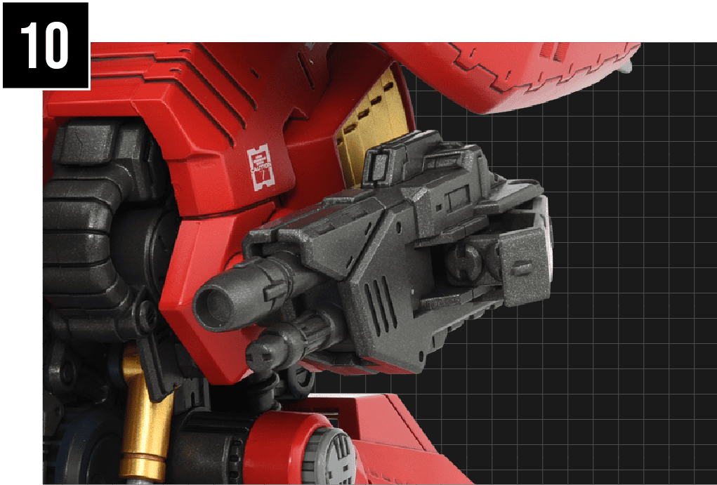 アニメ劇中と同様にフリーラウンドシールドの一部パーツを黒色にて再現。