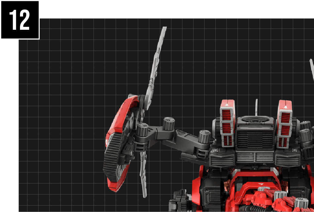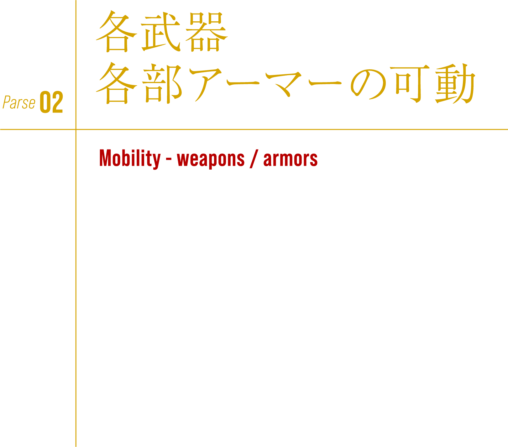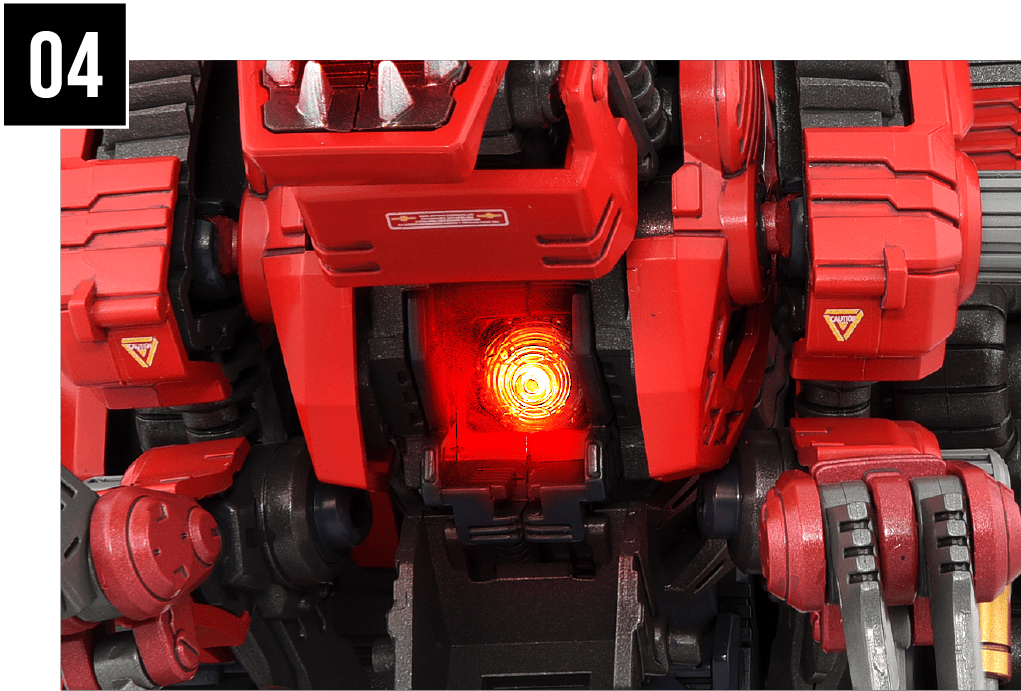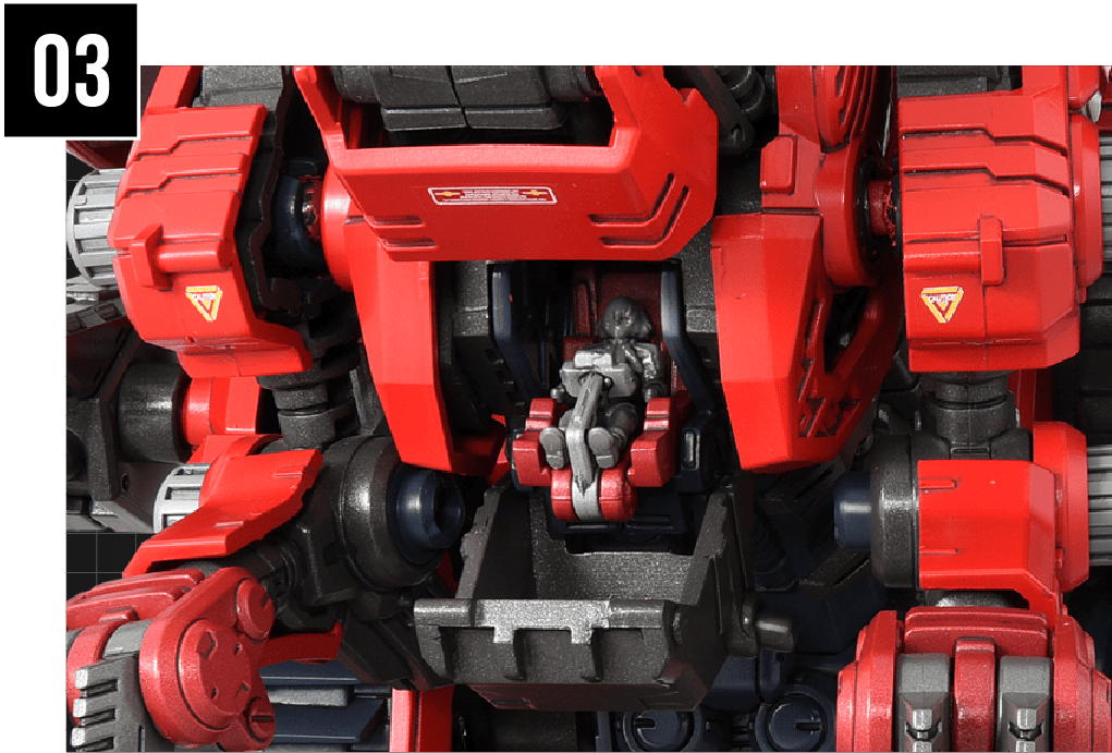 頭部レーザーチャージングの上下可動、脚部ウェポンバインダーの開閉、ならびにコックピットハッチの開閉など各部アーマーパーツが可動。さらにジェノブレイカーの象徴であるブレイカーユニットは、パーツの一部を変形させることで、背部アームを可動モードに変更することが可能。多数の可動パーツを搭載することで、兵器としてのメカニカルな見せ場を作り出す。