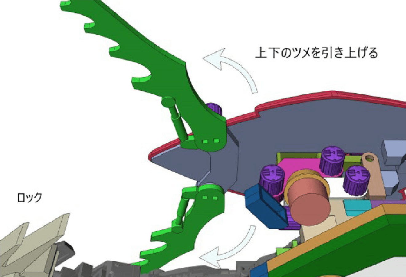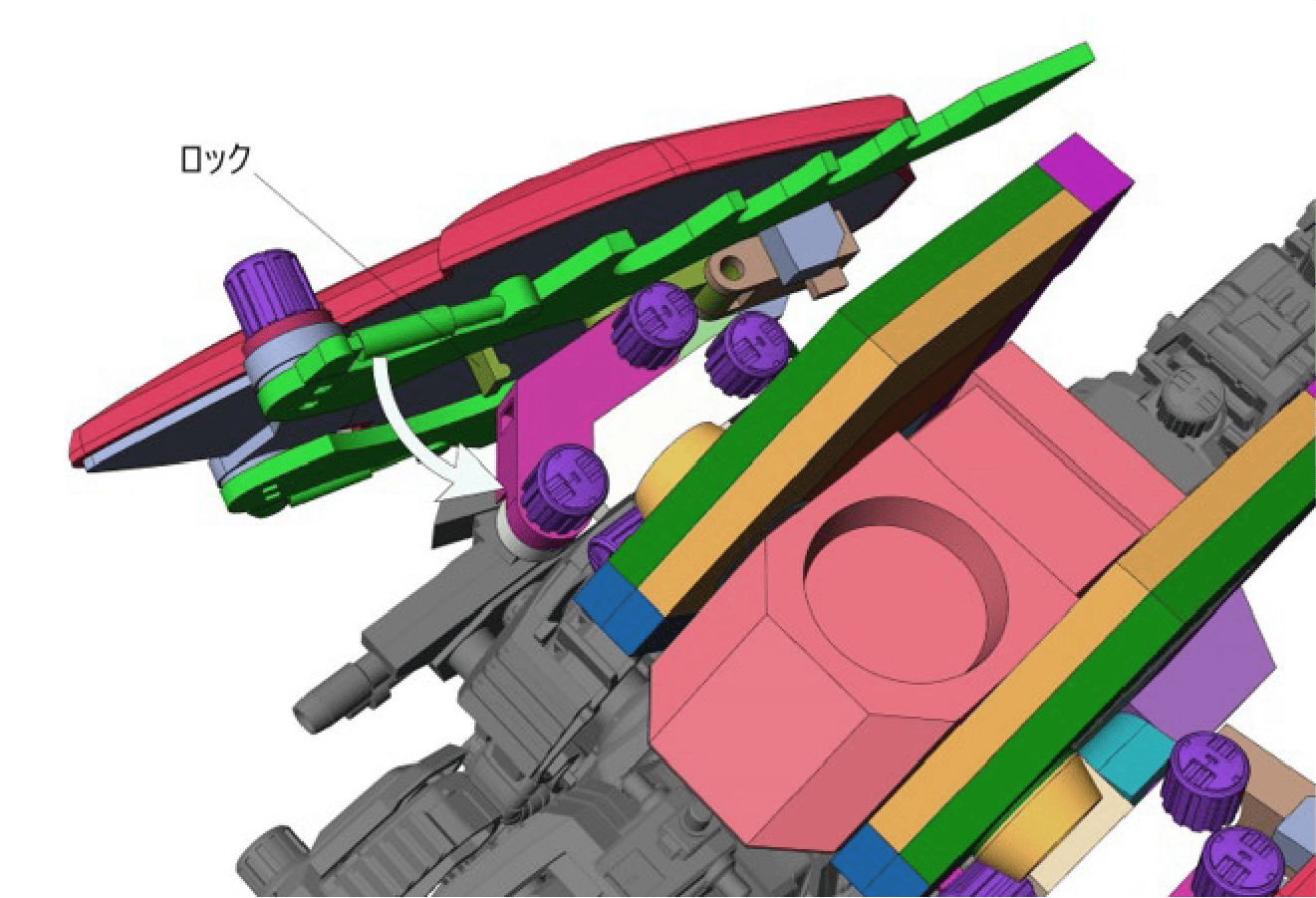 後部には第2ロックが存在。このパーツは電動とポージングギミックの切り替えを両立する、要となるロックである。