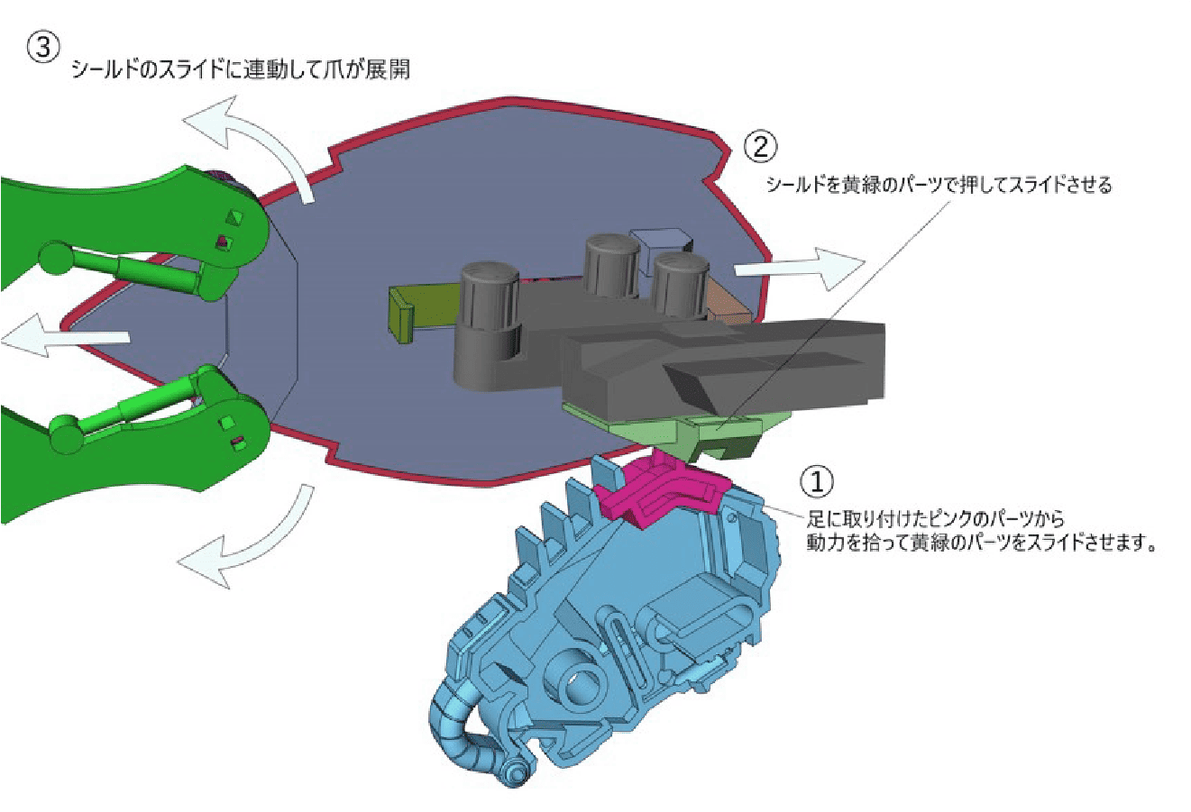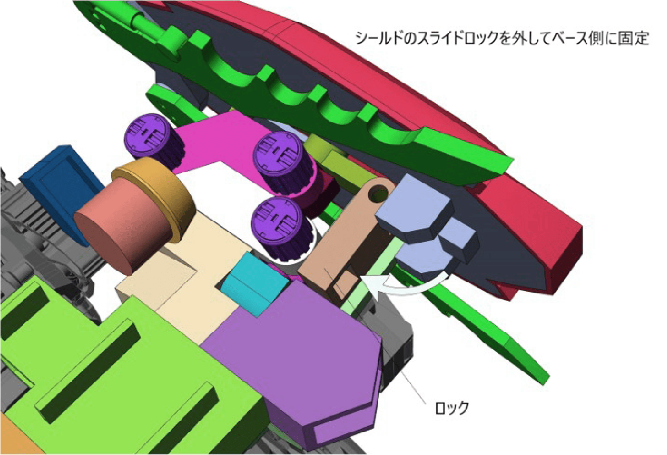 ロックの切り替えによって、電動モードではフリーラウンドシールドが前後に動作し、同時にエクスブレイカーも開閉する。