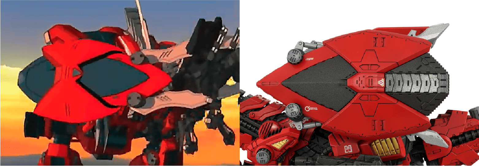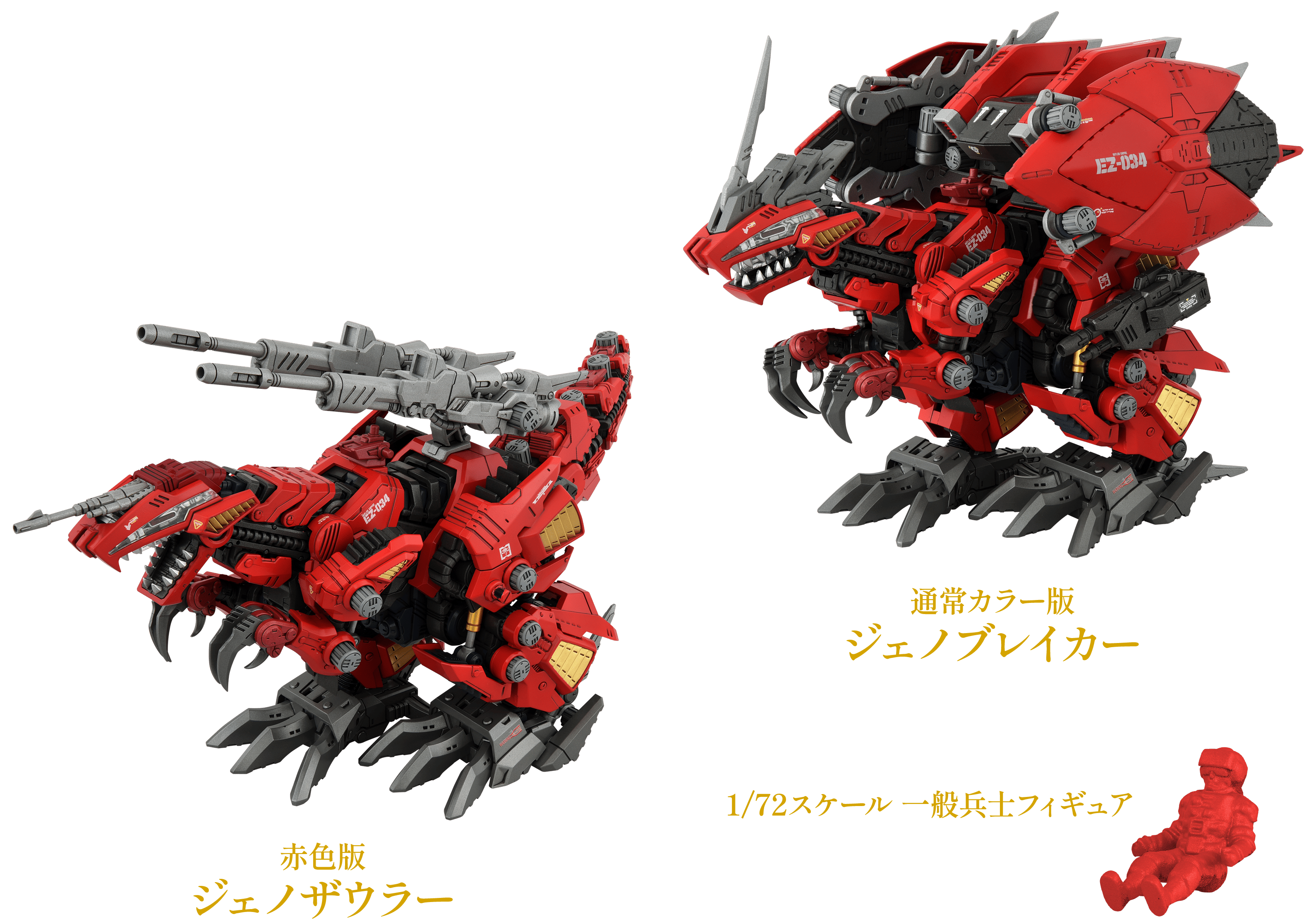 通常カラー版のジェノブレイカーが再現可能なフリーラウンドシールド別パーツと顔部の別パーツも付属。さらにジェノザウラーの各種アーマーパーツも付属しており、赤色に染まるジェノザウラーを組み立てることも可能となっている。