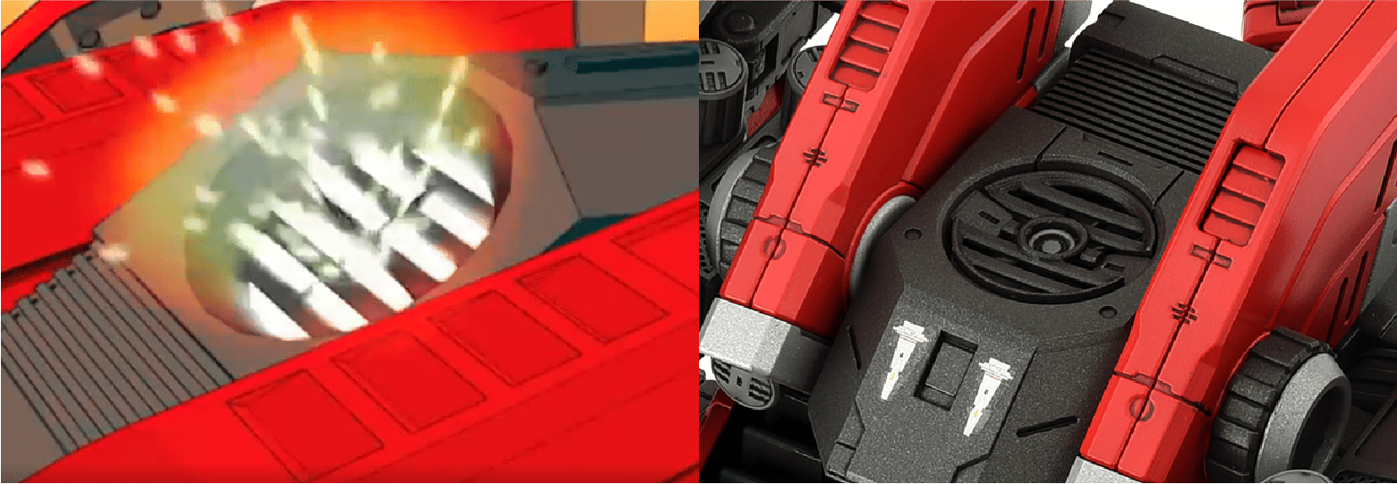 アニメ劇中と同様に荷電粒子砲発射シークエンス時の尾部排熱フィンの開閉を再現。