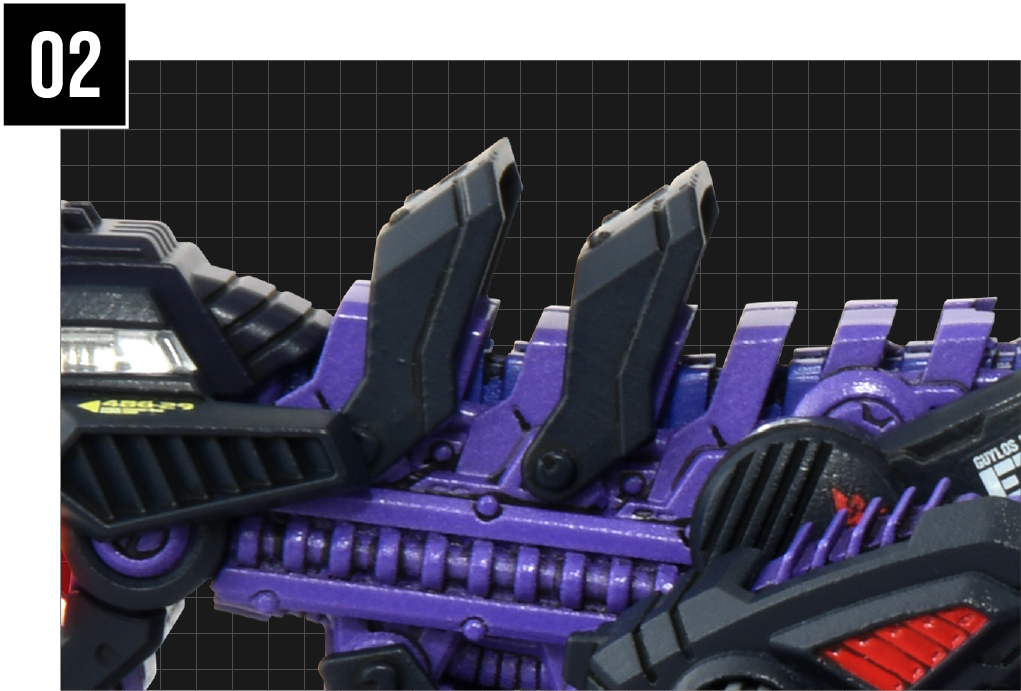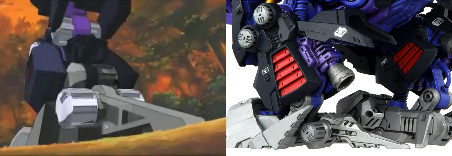 ジェノザウラーの特徴ともいえる、大型のフィンの裏には排熱機構を意識したディティールが追加されている。黄金のシリンダーは商品でも再現され、歩行と連動して伸縮が可能となっている。 さらに初代ジェノザウラーでは飾りパーツとして使用されていた装甲のキャップは、実際にフレームを固定するキャップに変更されており、機構を内蔵したゾイドらしさアップデートしている。 尚、この飾りキャップが持っていた武器のジョイント機能は、別途にジョイントを設けることで維持されており、拡張性は確保されている。