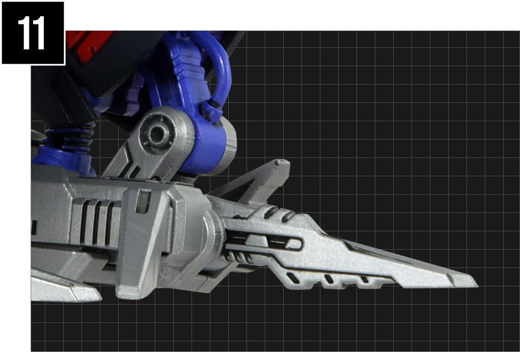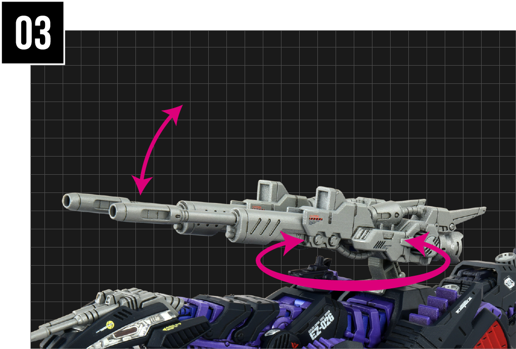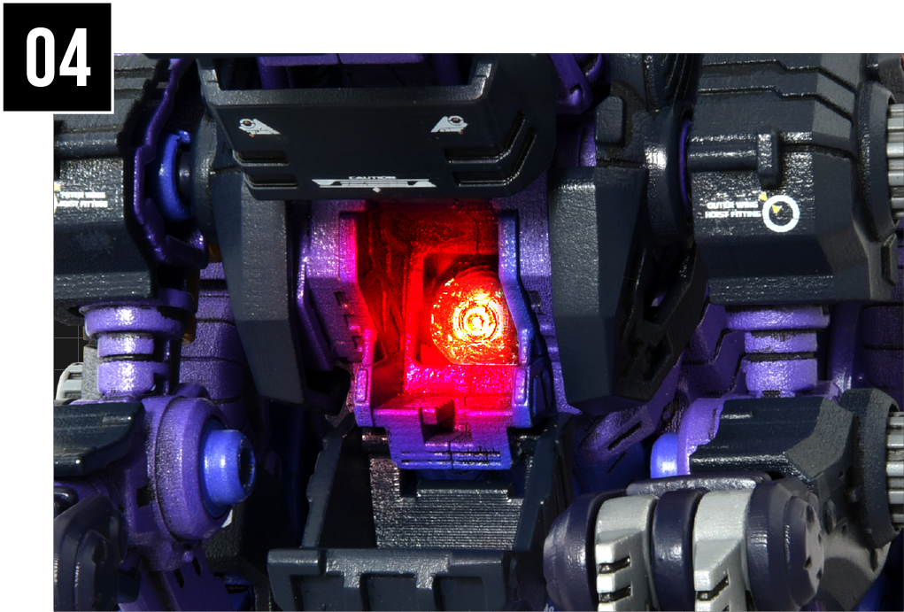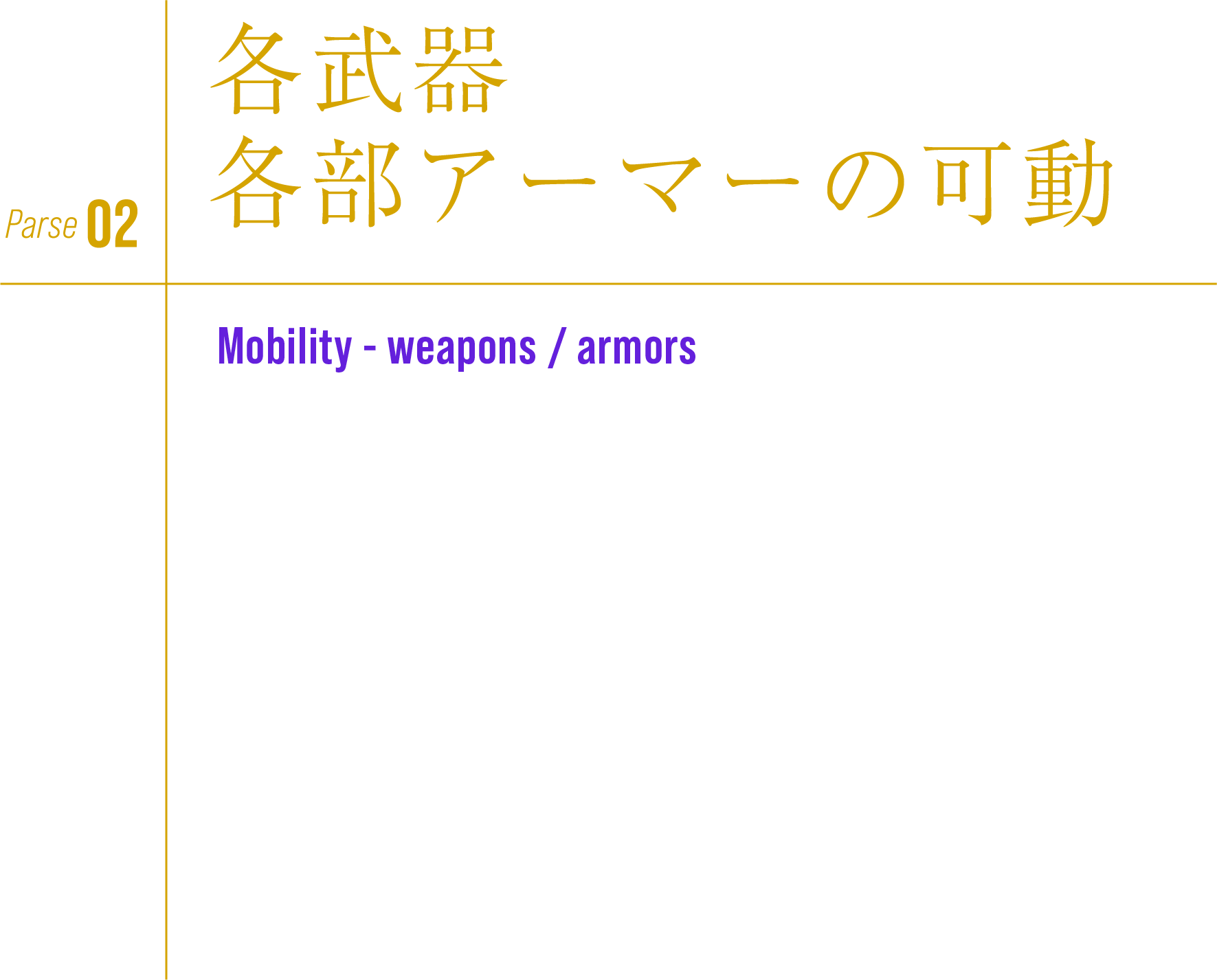 背部ロングレンジパルスレーザーライフルの左右回転・上下の仰角調整、ならびにコックピットハッチの開閉など各部アーマーパーツが可動。さらに頭部武器の差し替えにより、量産機/専用機の切り替えが可能。多数の可動パーツを搭載することで、兵器としてのメカニカルな見せ場を作り出す。