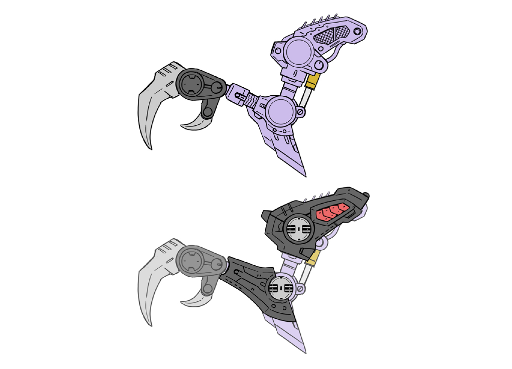腕部には手動での可動ギミックが搭載され、ユーザーの手で自由にポージングが可能となっている。肘にはシリンダーが搭載されており、肘の可動と合わせて実際に伸縮が可能である。手首だけでなくそれぞれの爪も個別に可動ができ、様々な表付けが可能となっている。