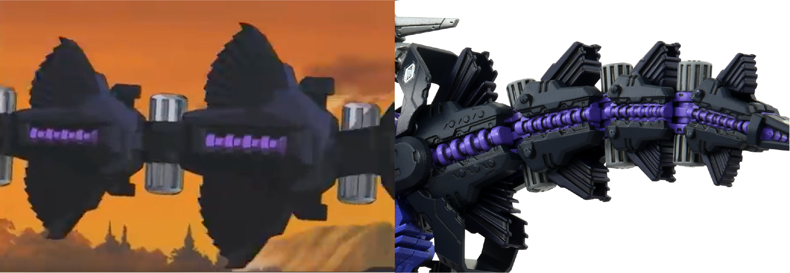 アニメ劇中にて描かれた荷電粒子砲発射シークエンス時の尾部排熱フィンの開閉を再現。