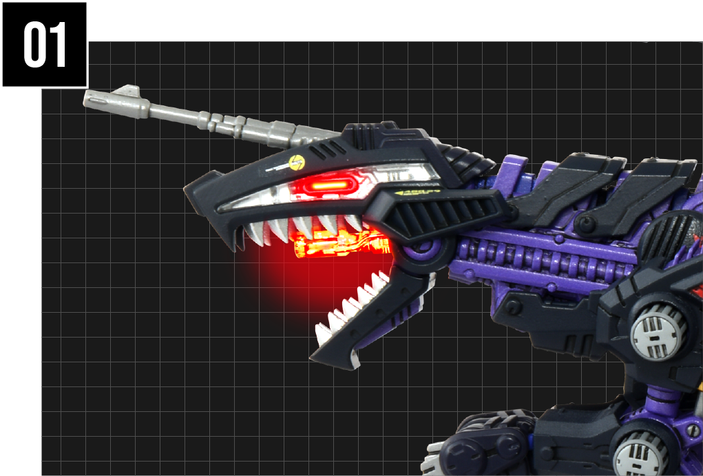 首は初代ジェノザウラーにあった荷電粒子砲発射形態への手動変形に加えて、新たに歩行との連動が両立した機構となっている。そのため、歩行時の動作はよりダイナミックに進化している。また内部にはメカディティールが施されたフレームが内蔵されており、金属生命体としての説得力を備えることを意識した。
