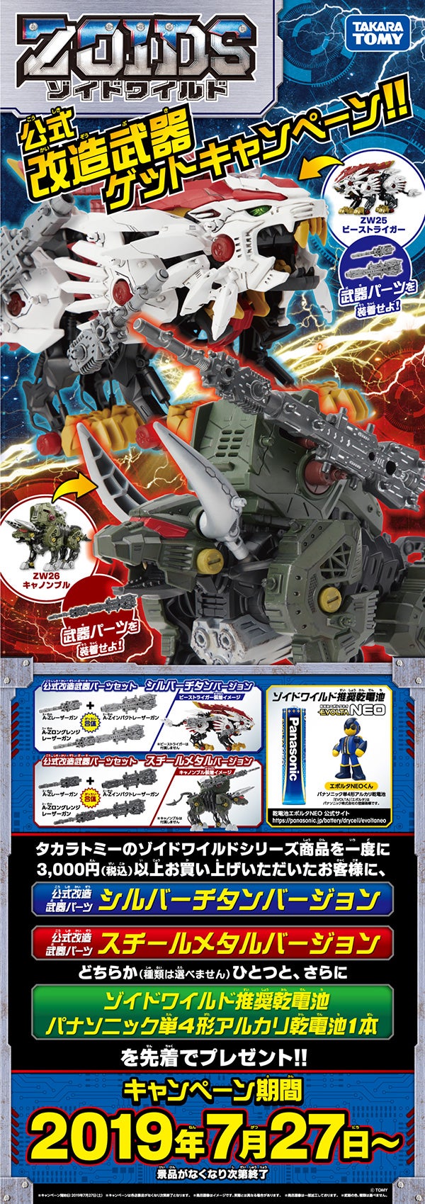 タカラトミーのゾイドワイルドシリーズを一度(いちど)に3,000円(えん)(税込(ぜいこみ))以上(いじょう) お買(か)い上(あ)げいただいたお客様(きゃくさま)にゾイドワイルド公式改造武器(こうしきかいぞうぶき)パーツ 「シルバーチタンVer.」「スチールメタルVer.」を先着(せんちゃく)でプレゼント!