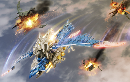 制空権をスナイプテラから取り戻すべく開発された飛行戦闘ゾイド。飛行時は背面のツインジェットエンジンと両翼のソニックウイングの羽ばたきで大空を舞う。進化解放は、翼の先端に出現するA-Zウイングソードと尾翼の左右に展開するラダーソードで敵を切り裂く「スカイスラッシュ」。