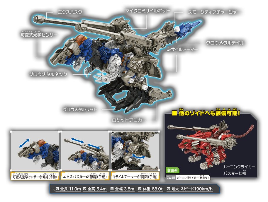 ゼノレックスのデータバンクに残(のこ)されていた記録(きろく)を元(もと)に開発(かいはつ)された砲撃兵装(ほうげきへいそう)。ゼノレックスに装備(そうび)し巨大化換装進化(きょだいかかんそうしんか)をすることでゼノレックス・バスターとなる。キャノン砲(ほう)やミサイルが搭載(とうさい)されており、頭部(とうぶ)に装備(そうび)される可変式光学(かへんしきこうがく)センサーと併用(へいよう)することで高精度(こうせいど)での砲撃(ほうげき)を可能(かのう)とする。