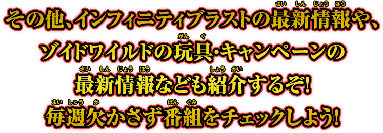 最新情報の紹介やZiNAコードを使った大会が行われる新番組を毎週金曜日配信中! 大会参加者や、番組に応募してくれた視聴者から抽選で景品をプレゼント! 「ゾイドワイルド インフィニティブラスト」の情報はこの番組でチェックだ!