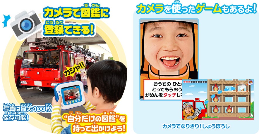 また、カメラを搭載しており、自分で撮影した写真をその乗りものの図鑑ページに登録でき、オリジナルの図鑑を作ることができます。