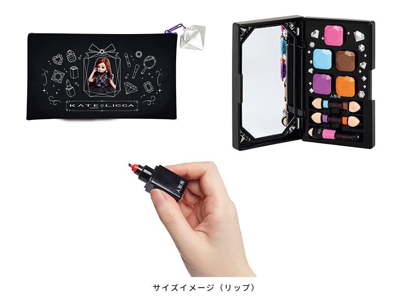 商品は全3種類で、「リカちゃん」と5色のメイクパクトやメイクポーチがついたデラックスセット「KATE LICCA -Make My Color- DX」(希望小売価格:8,250円/税込)、メイクの詰め替え用インクのリフィルセット「KATE LICCA メイクリフィルセット」(希望小売価格:2,200円/税込)などもラインアップします。