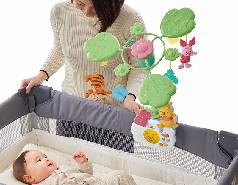 本商品のポイントのひとつとして、専用パーツ(別売)を取り付けることで折りたたみベビーベッドにも対応できるようにしました。昨今自宅だけでなく里帰り出産等の育児環境や居住スペースの変化で折りたたみのベビーベッドを使用されるご家庭が増えたことを受けたものです。また、組み替えの際により簡単に取り付けられるようにしたり、操作パネルにたいこ遊びの要素を追加、操作しやすいボタンのレイアウトにするなど、調査からの生の声を反映しながら、子育てに向き合ってきた開発者たちがお子さまの育児をサポートしたいという思いを込めて開発しました。