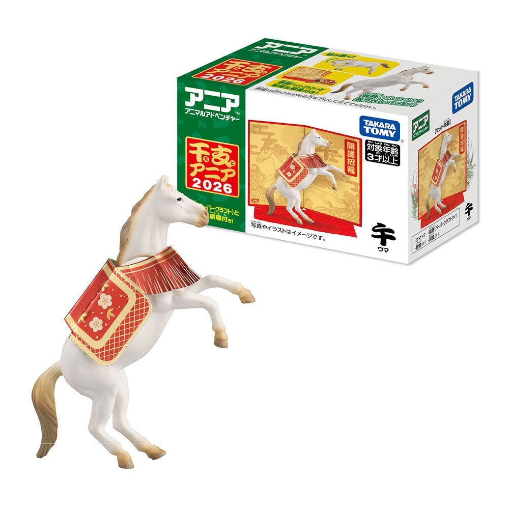 株式会社タカラトミー(代表取締役社長:富山彰夫 /所在地:東京都葛飾区)は、来年の干支をモチーフにした、動かして遊べる手のひらサイズのアクション付き動物フィギュア「干支アニア 午(ウマ)」(希望小売価格:770円/税込)を、2025年11月8日(土)から全国の玩具専門店、百貨店・量販店等の玩具売場、インターネットショップ、一部の書店、タカラトミーの公式ショッピングサイト「タカラトミーモール」(takaratomymall.jp/)等で発売します。また、本商品はアジア8の地域(日本、中国、香港、台湾、シンガポール、フィリピン、タイ、ベトナム)でも発売予定です(日本以外の地域は順次入荷)。