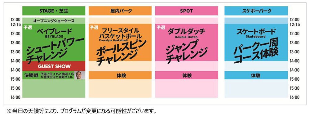4競技「ベイブレード」 「フリースタイルバスケ」 「ダブルダッチ」 「スケートボード」の体験ブース