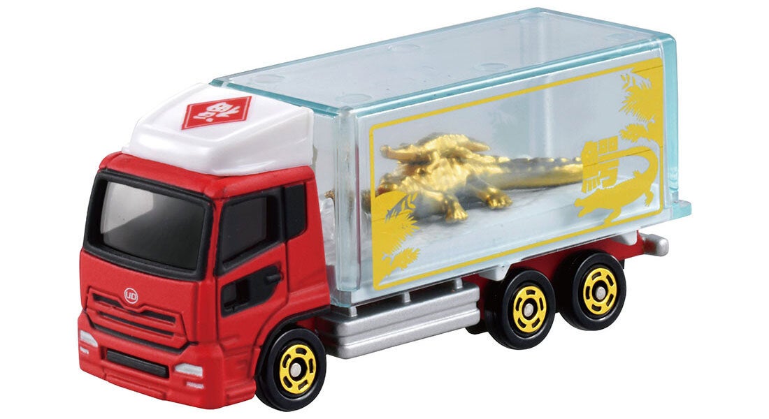 富の守り神と言われる幸運の金の鰐(わに)を乗せたトラックを表現しています。