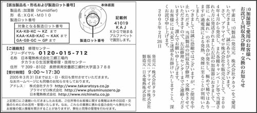 さて、プラマイゼロ株式会社を販売元として2004年4月から2005年2月まで販売し、また各種キャンペーン等で当選された方に発送されました「加湿器 XQK-M010」(発売元 株式会社タカラ)におきまして、一部に「水漏れ」の不具合が発生し、極めて稀ではありますが、過電流による発熱、発煙に至ることが判明したため、2005年2月に新聞広告等を実施し、商品の回収を行ってまいりましたが、現時点において未回収の商品がございます。 つきましてはお客様の安全を期するため、また、事故防止の観点から、速やかな使用の中止と、商品回収にご協力賜りますよう、再度お願い申し上げます。